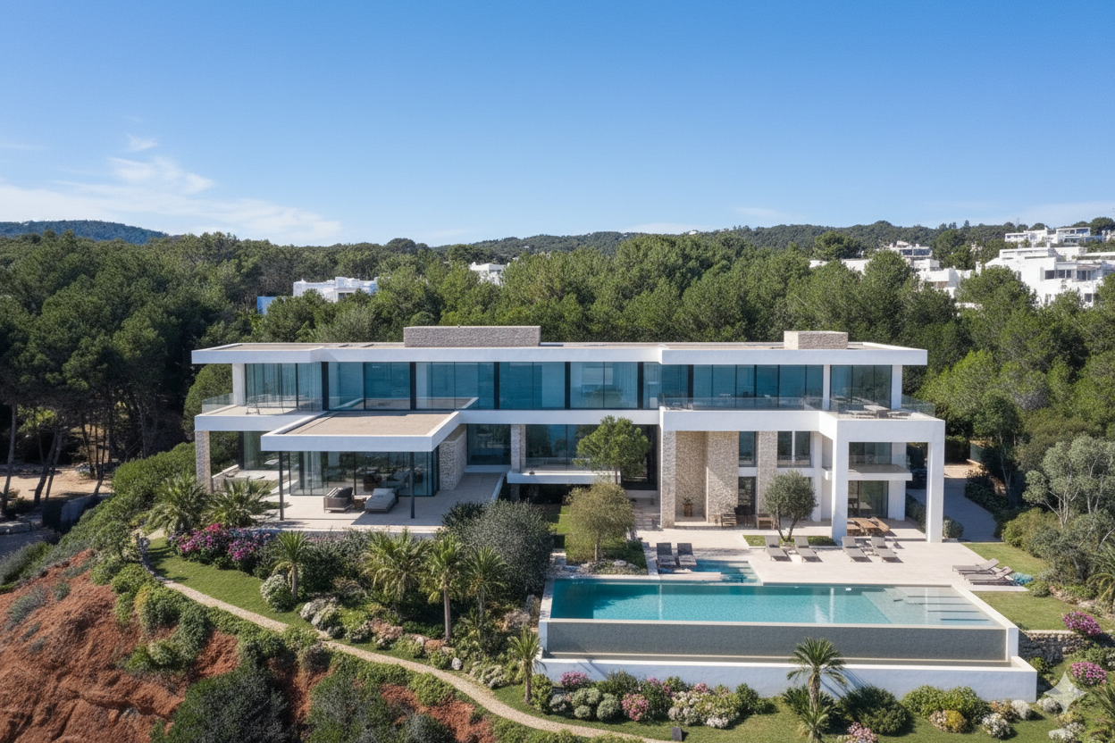 In unvergleichlicher Lage – hoch über einer der schönsten Buchten der Insel – thront diese architektonisch meisterhafte Luxusresidenz. Mit ihrer klaren, modernen Formensprache, raumhohen Glasfronten und großzügigen Terrassen vereint sie zeitlose Eleganz mit mediterranem Lebensgefühl.